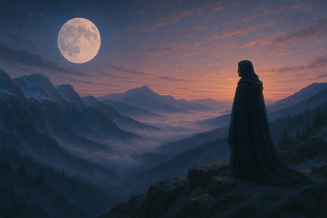 At twilight, the Capricorn Moon stands upon her ridge, the valleys below wrapped in silver fog.